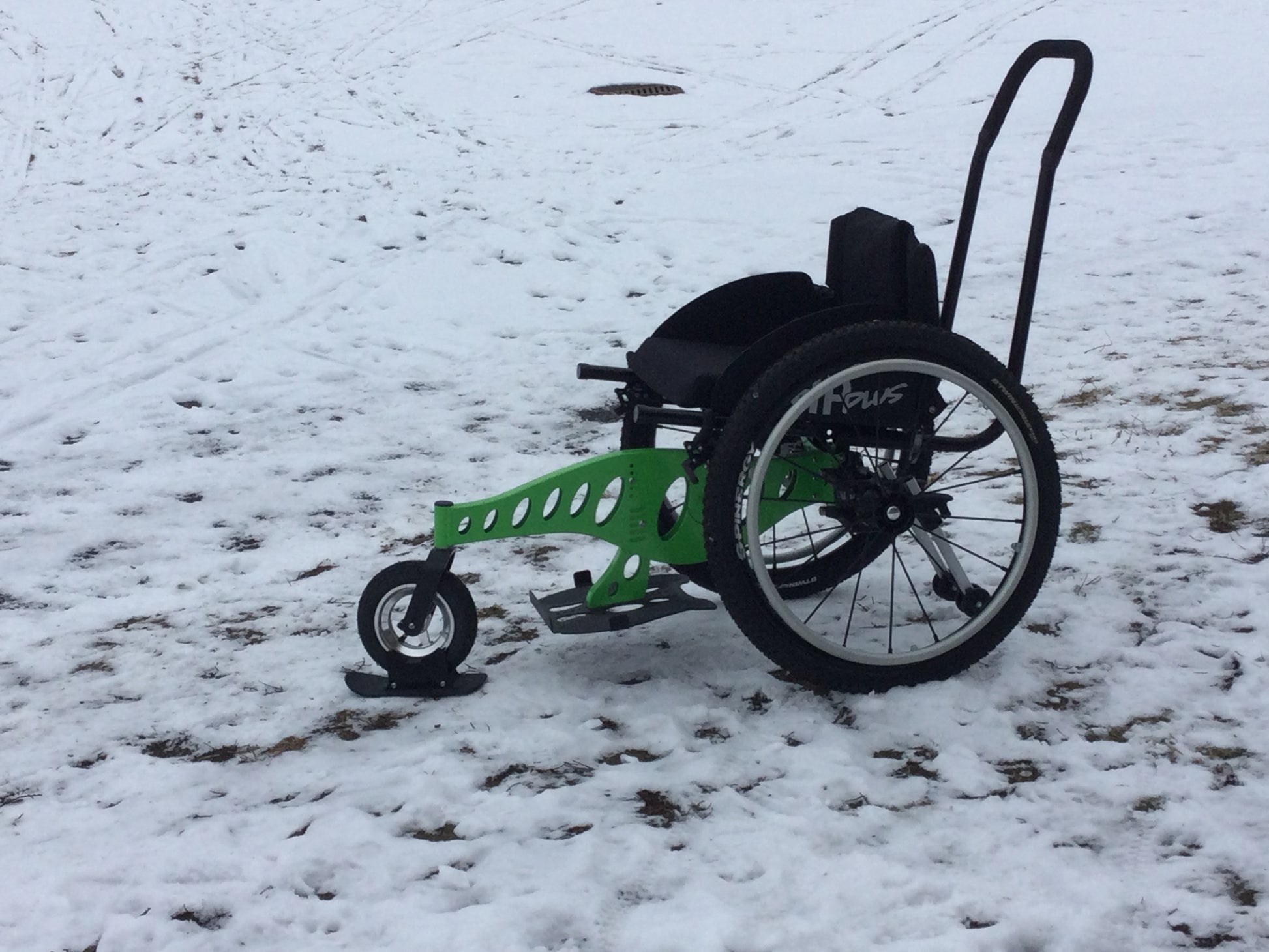 Self-guided rental of a green all-terrain chair from TrackZ Mobility, HP + adult model, for a walk on the Sentiers de la Capitale and Gatineau Park. You can rent this chair at the Relais plein air du Parc de la Gatineau.